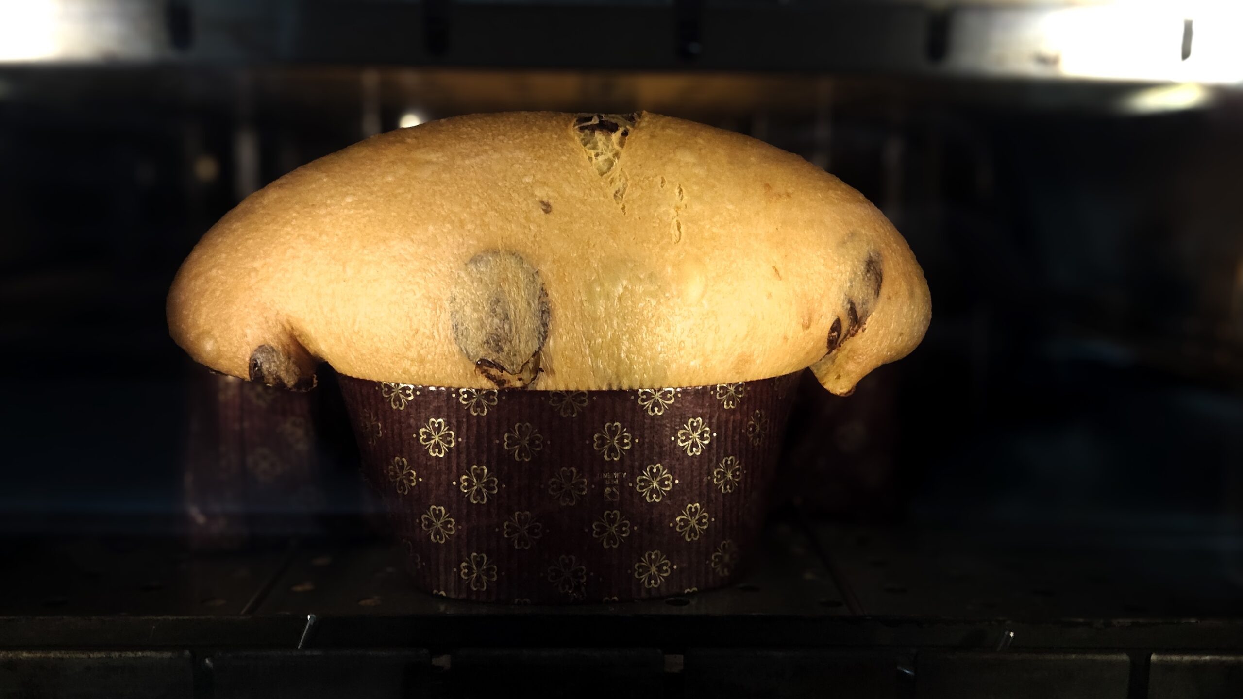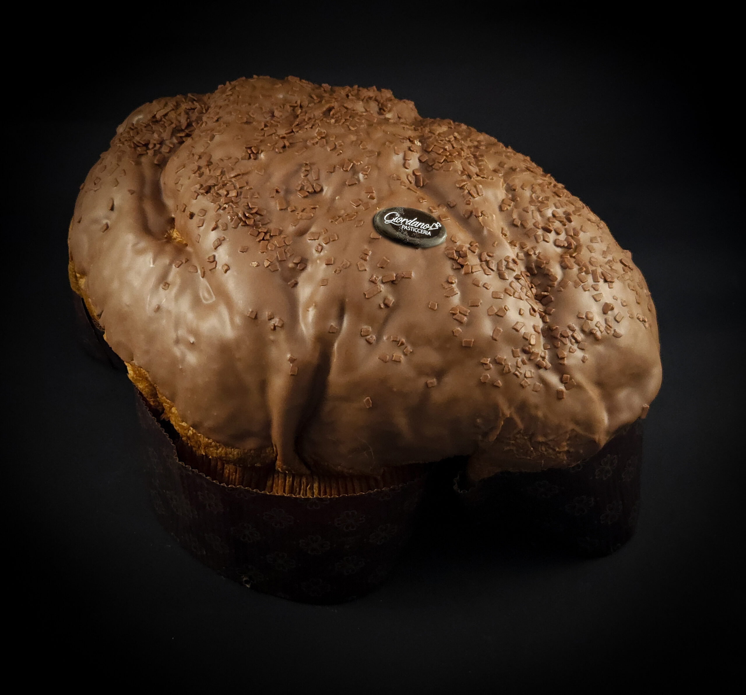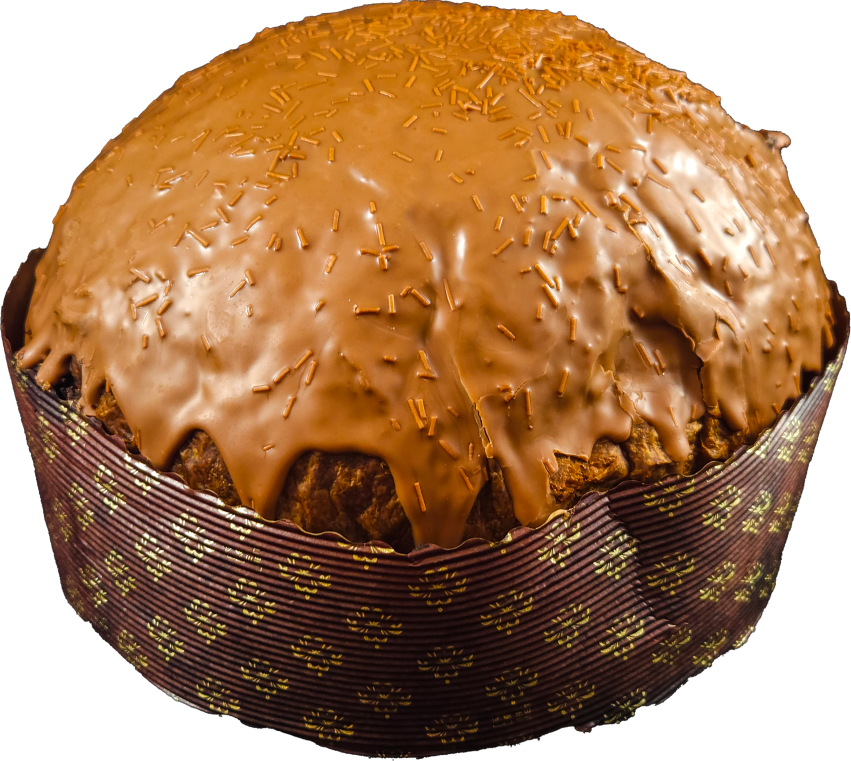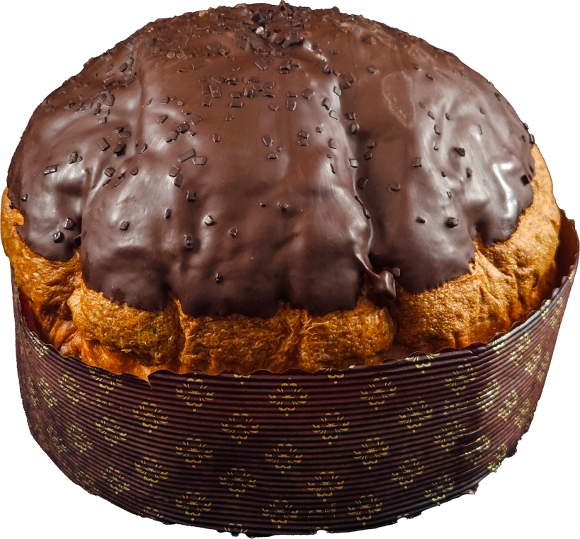 Panettone Artigianale farcito con gocce di Cioccolato Fondente e copertura al Cioccolato al Latte.