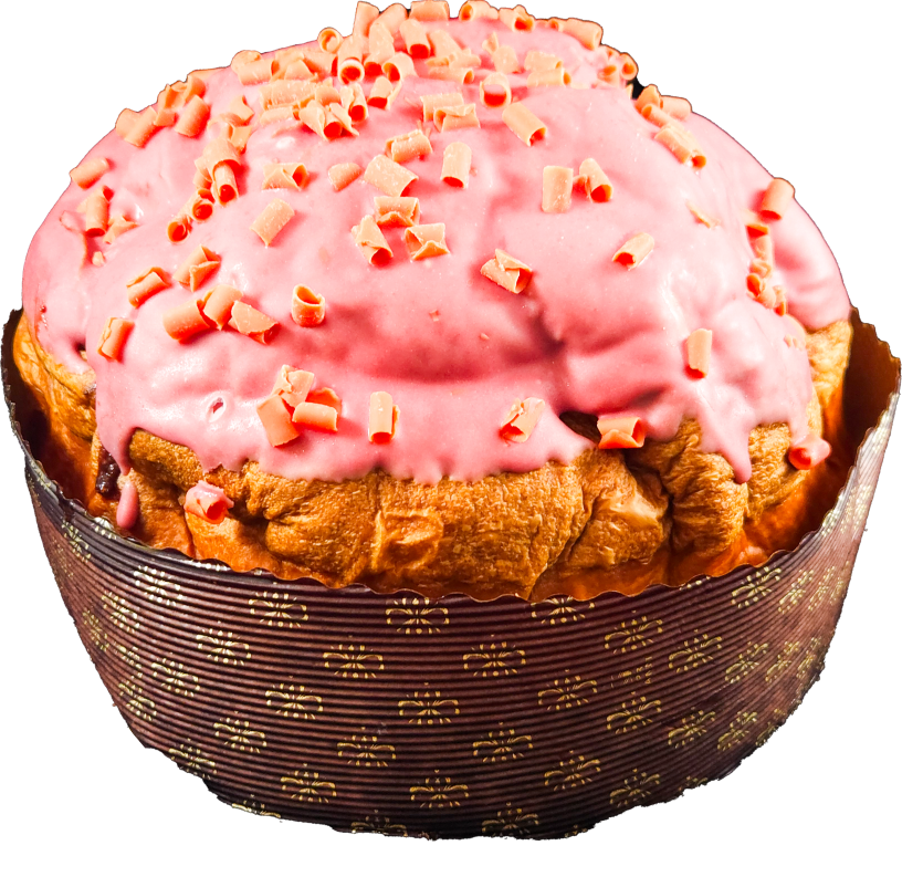 Panettone Artigianale farcito con Frutti di Bosco e copertura al Cioccolato ai Lamponi.