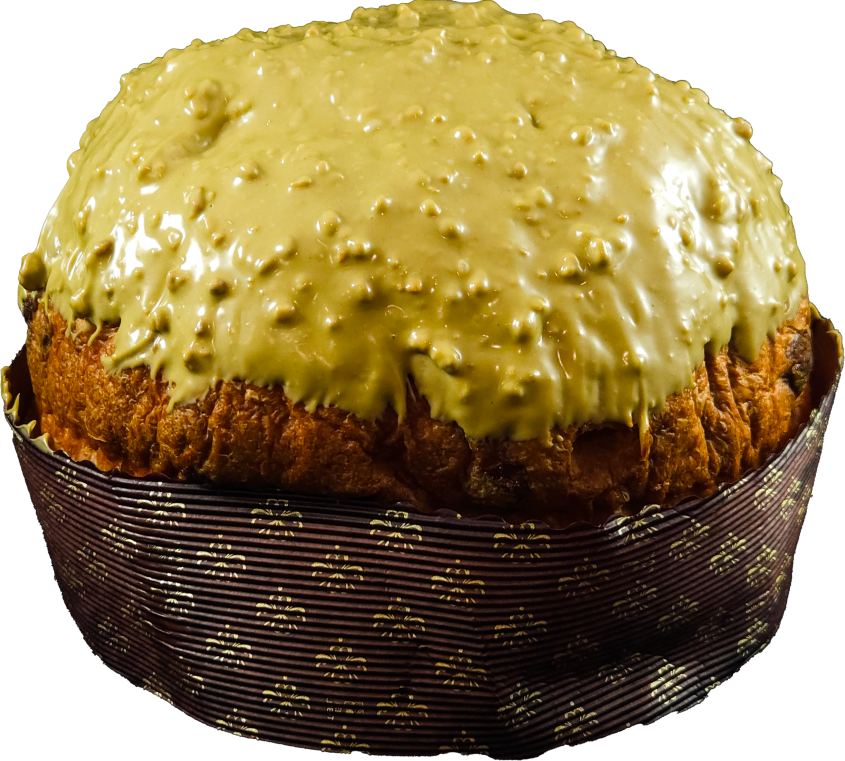 Panettone Artigianale con farcitura al Pistacchi e Cremino di Pistacchi e copertura al Cremino di Pistacchi.